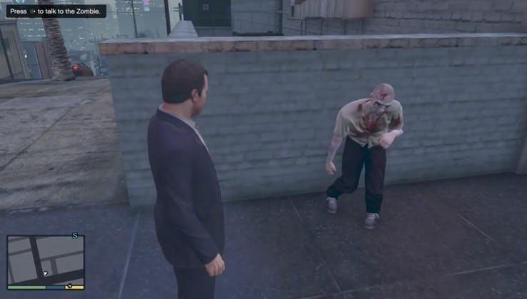Vinewood está llena de todo tipo de rarezas, y quizás la persona más extraña que conocerás en sus calles: un zombie. Probablemente sea «un actor» que ensaya para una audición o algo parecido.